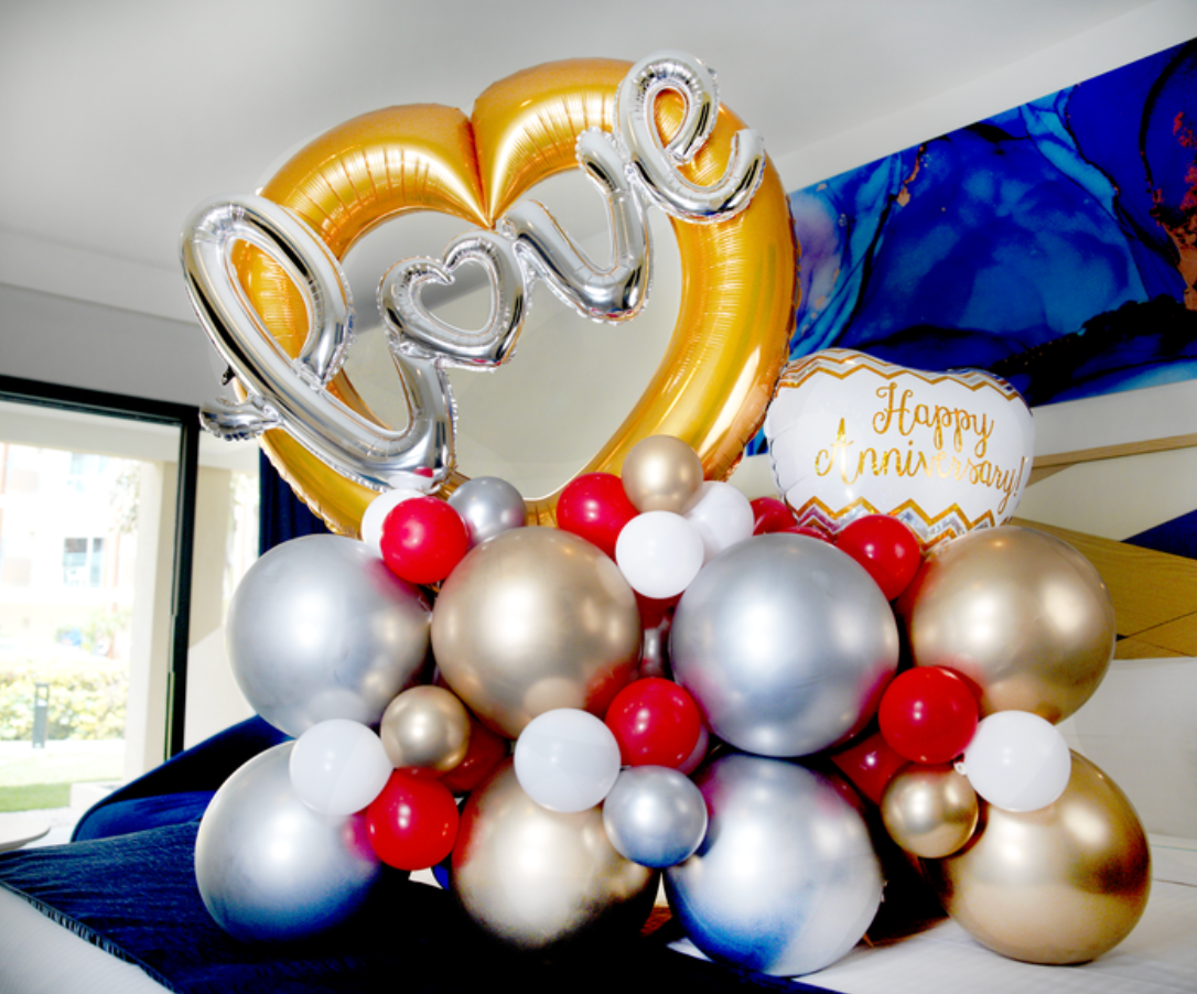Large arrangement with color balloons and a graphic a foil "I LOVE YOU" balloon.